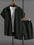 It comes with a short-sleeve button-up shirt, light and modern, paired with a basic white t-shirt for contrast. The black shorts with drawstring adjustment provide comfort and freedom of movement for everyday wear.