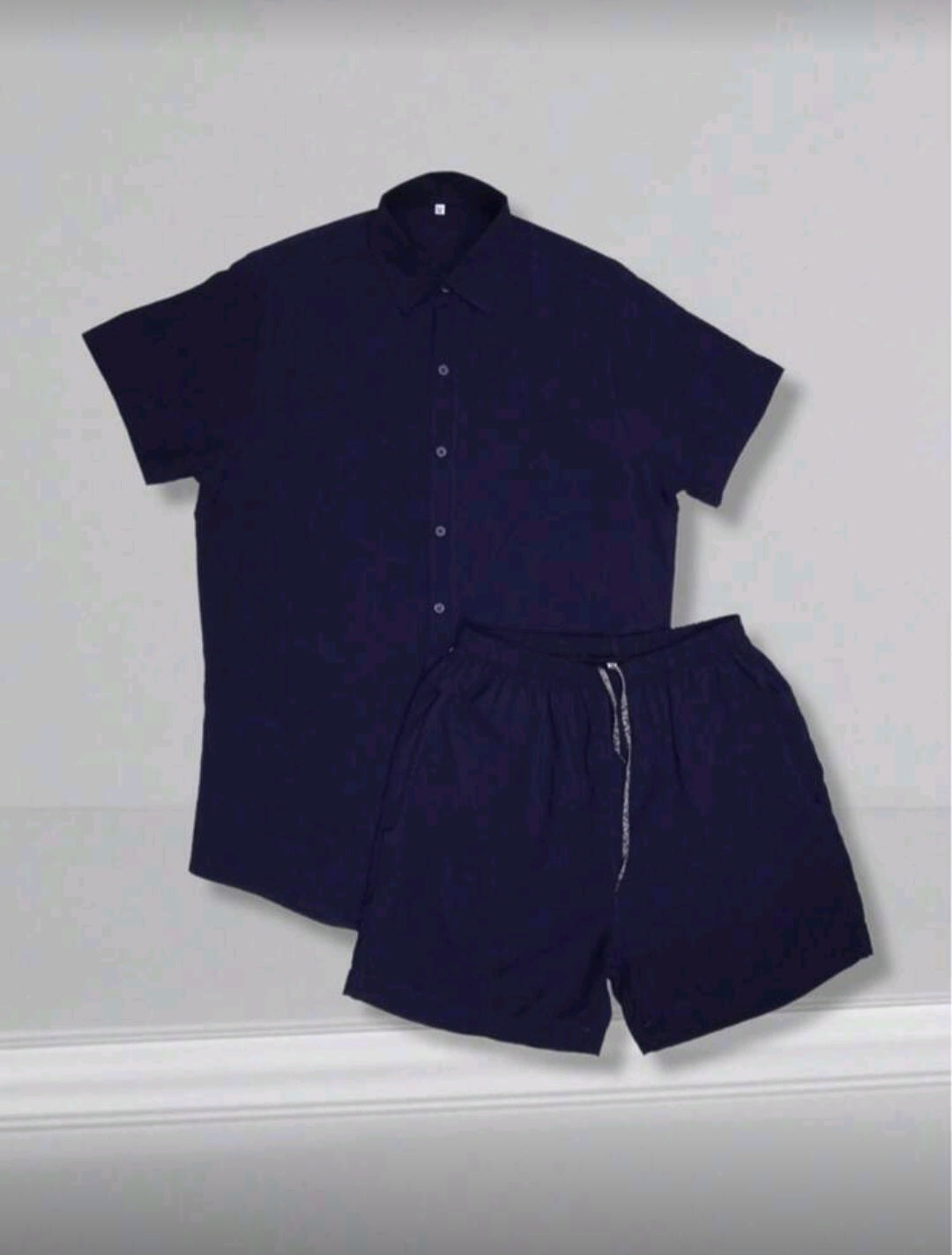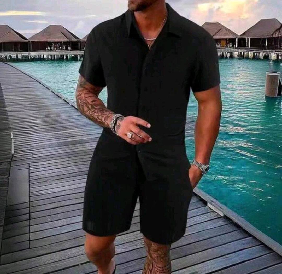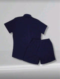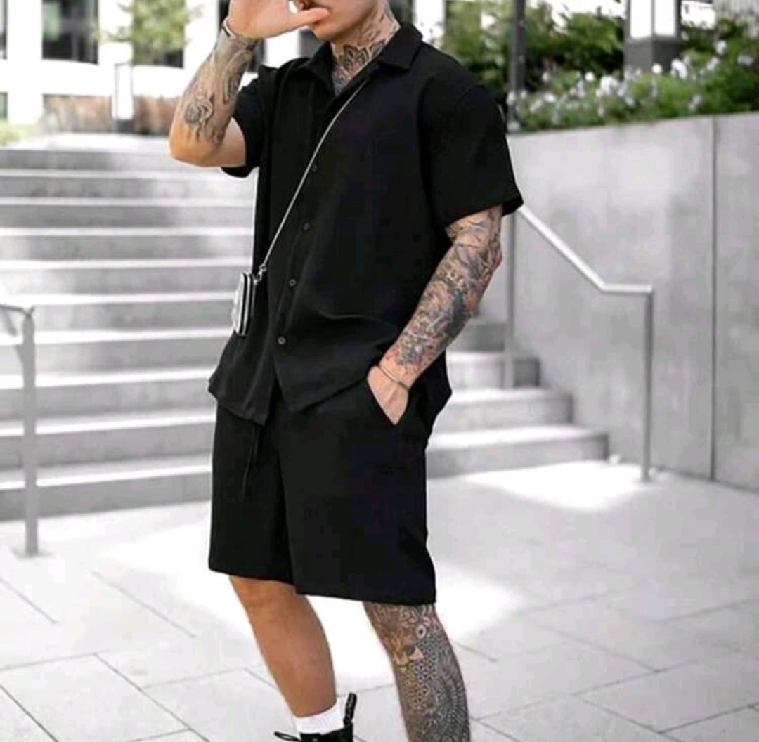 This set features a short-sleeve black button-up shirt with a modern and versatile design, ideal for casual occasions or relaxed moments.