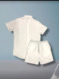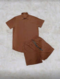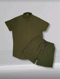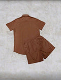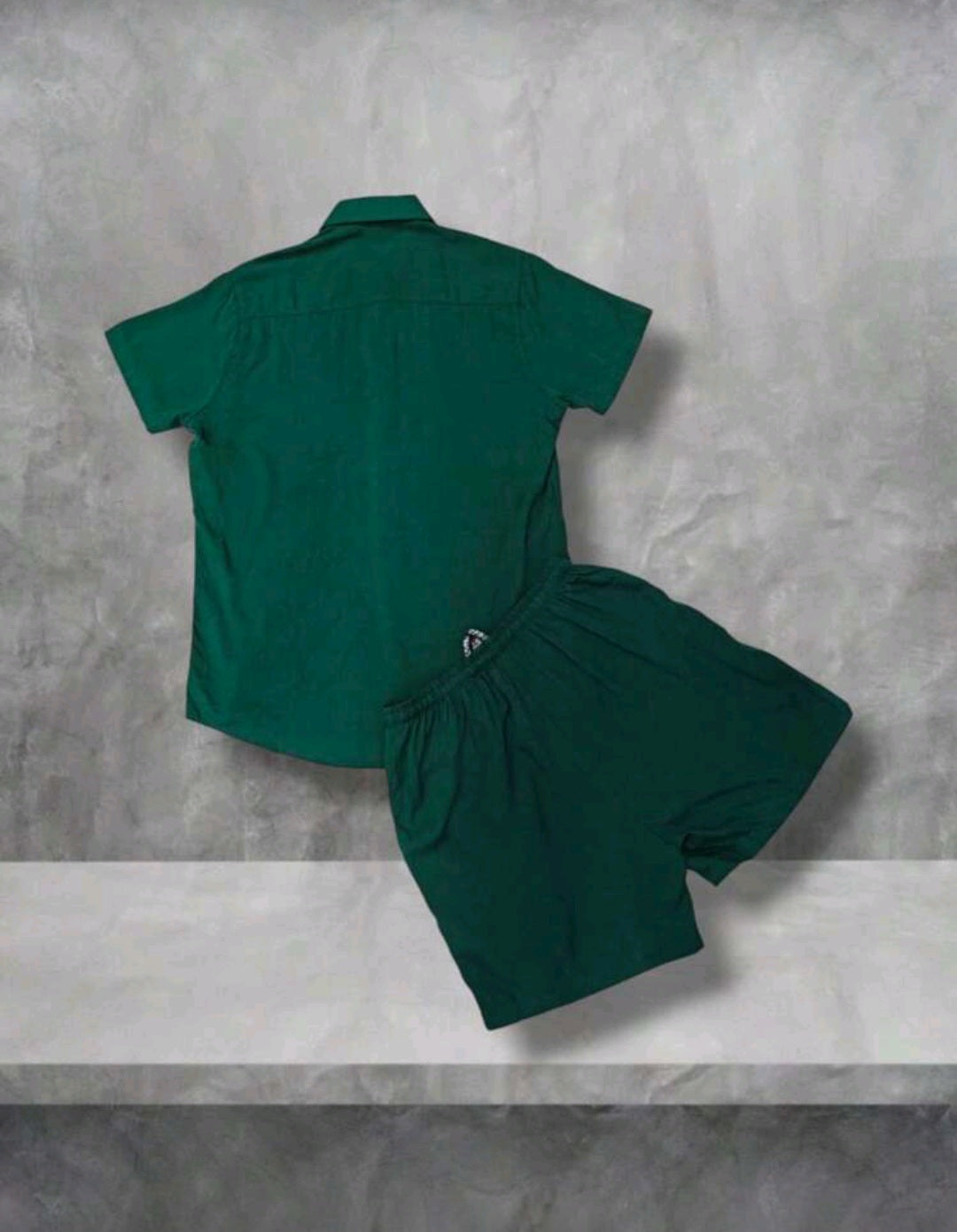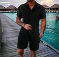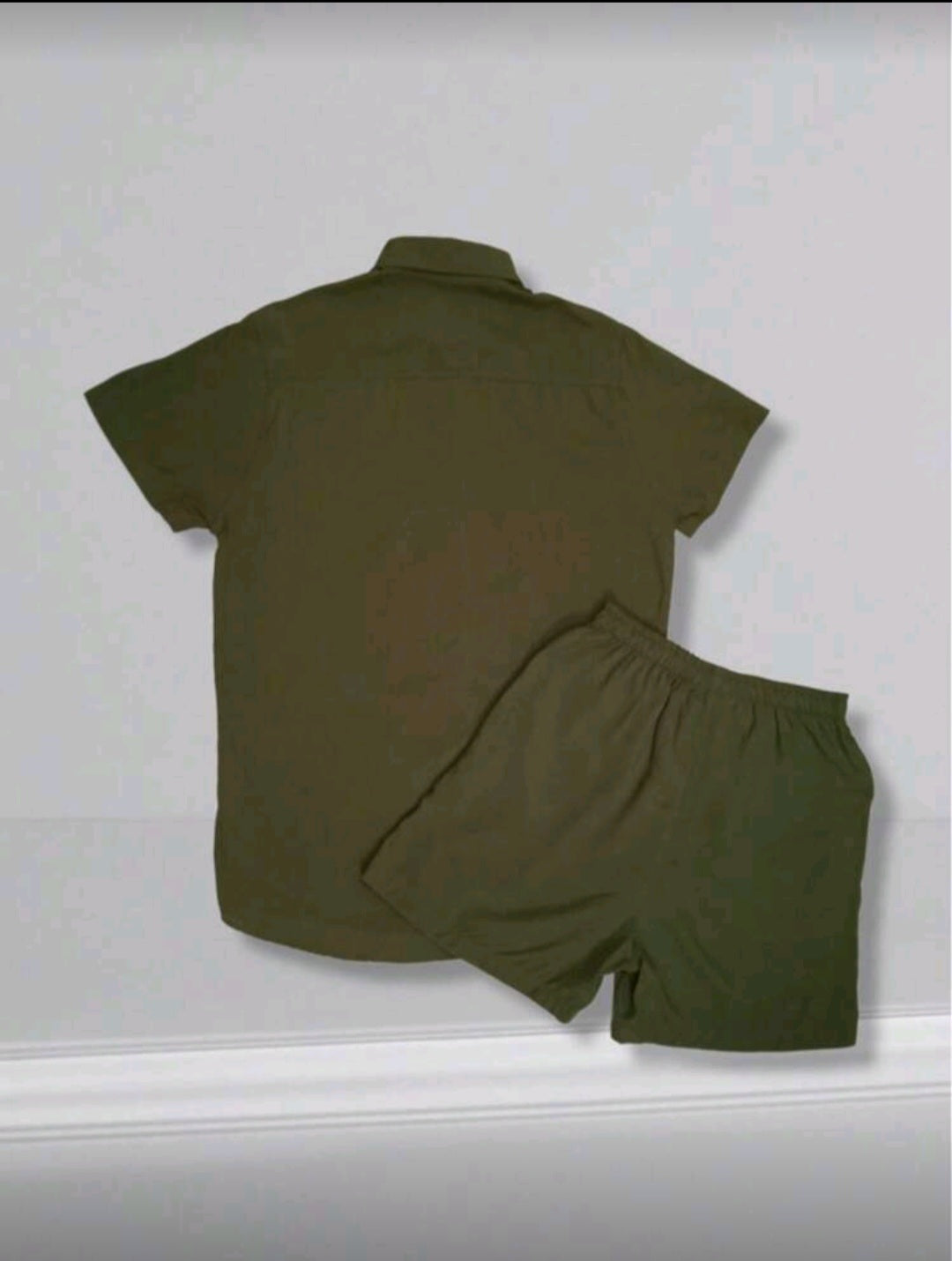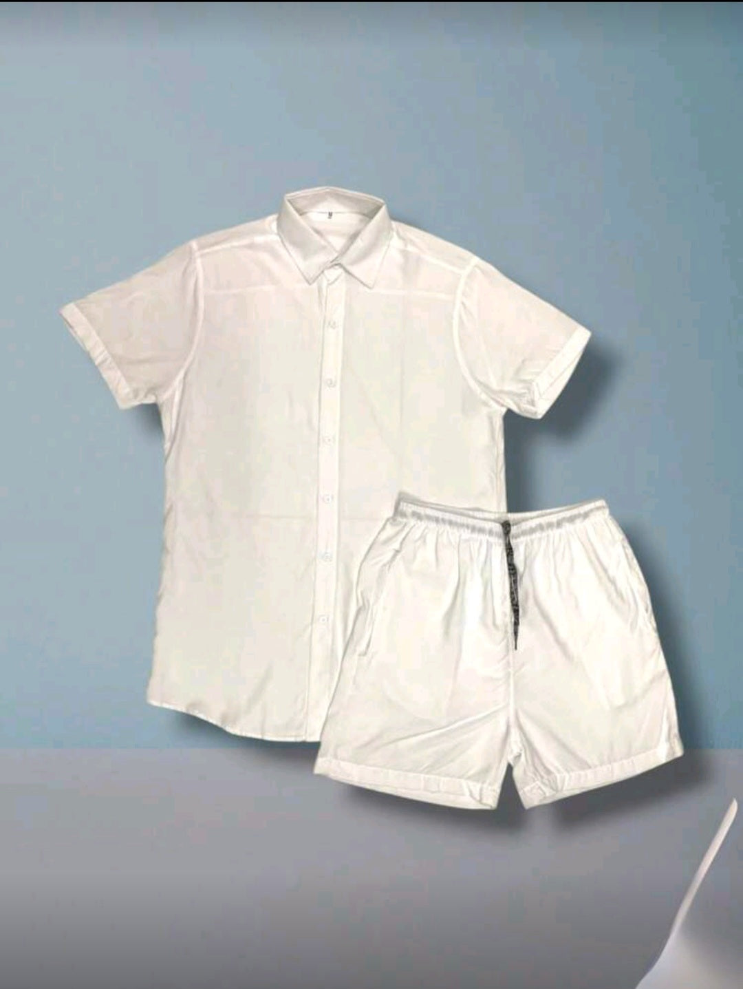 This set features a short-sleeve black button-up shirt with a modern and versatile design, ideal for casual occasions or relaxed moments.